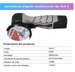 Compacto inalámbrico: el mini cuerpo hace que este molinillo sea muy flexible en tus manos, incluso si estás trabajando lejos de la fuente de alimentación, no tienes que preocuparte por el enchufe porque no necesita estar enchufado para funcionar. También puede eliminar material rápidamente, ahorrándole tiempo y esfuerzoPaquete de batería de gran capacidad: esta amoladora angular recargable funciona con batería, no tiene que preocuparse por la fuente de alimentación, adecuada para trabajos al aire libre. Equipado con 1 juego de batería de litio de 2000 mAh y cargador. La batería de iones de litio tiene protección contra sobrecarga y temperatura para prolongar la vida útil de la batería.,Protección de seguridad: Durante el funcionamiento, la cubierta protectora del molinillo portátil evita que se generen chispas y virutas de metal durante el uso, protegiéndolo así de lesiones. Múltiples usos: esta mini amoladora angular es adecuada para cortar pisos, cortar azulejos, etc. También se puede usar para esmerilar, pulir y cortar metalesInalámbrico y de larga duración:El cable elimina el problema de los cables de bobinado y ofrece una gran comodidad de llevar, adecuado para uso en interiores y exteriores. Mientras tanto, equipado con una batería de iones de litio recargable de gran capacidad de 16.8 V 2000 mAh y un cargador rápido, puede mantener la amoladora angular inalámbrica funcionando de manera estable durante mucho tiempo.Detalles ergonómicos:La parte del cuerpo de la amoladora angular también está cubierta con un cómodo material de goma, con grano antideslizante, que ofrece una mejor experiencia de uso. Sistema de cambio rápido para muela y muela de corte.Ampliamente utilizado para moler, cortar, lijar y pulir diversos materiales, incluidos metal, azulejos, hormigón, tuberías, conductos y otros materiales sólidos. Descripción del producto Especificación: Tipo de artículo: Mini amoladora angular Material: ABS Peso: Aprox. 1600 g/56,4 oz Tamaño del producto: aprox. 20 x 10 x 4,7 cm/7,9 x 3,9 x 1,9 pulgadas Capacidad de la batería: 2000 mAh Modelo de batería: Voltaje: de 110 a 240 V