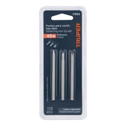 Puntas De Repuesto Para Cautín Tipo Lápiz Cau-45 Marca: Truper Código: 17553 CARACTERÍSTICAS ¤ Fabricadas en cobre niquelado. ¤ Longitud: 67 mm. ¤ Diámetro: 4.5 mm. ¤ Repuesto para cautín tipo lápiz Truper CAU-45. INCLUYE ¤ 1 Punta cónica. ¤ 1 Punta cónica fija. ¤ 1 Punta en “V”. Política de garantía El producto cuenta con 1 año de garantía directamente con la marca, puede ser tramitada por nosotros.